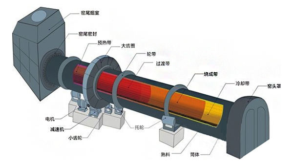回轉(zhuǎn)窯(旋窯)是一個(gè)有一定斜度的圓筒狀物,斜度為3~3.5%,借助窯的轉(zhuǎn)動(dòng)來促進(jìn)料在回轉(zhuǎn)窯(旋窯)內(nèi)攪拌,使料互相混合、接觸進(jìn)行反應(yīng)。窯頭噴煤燃燒產(chǎn)生大量的熱,熱量以火焰的輻射、熱氣的對(duì)流、窯磚(窯皮)傳導(dǎo)等方式傳給物料。物料依靠窯筒體的斜度及窯的轉(zhuǎn)動(dòng)在窯內(nèi)向前運(yùn)動(dòng)。