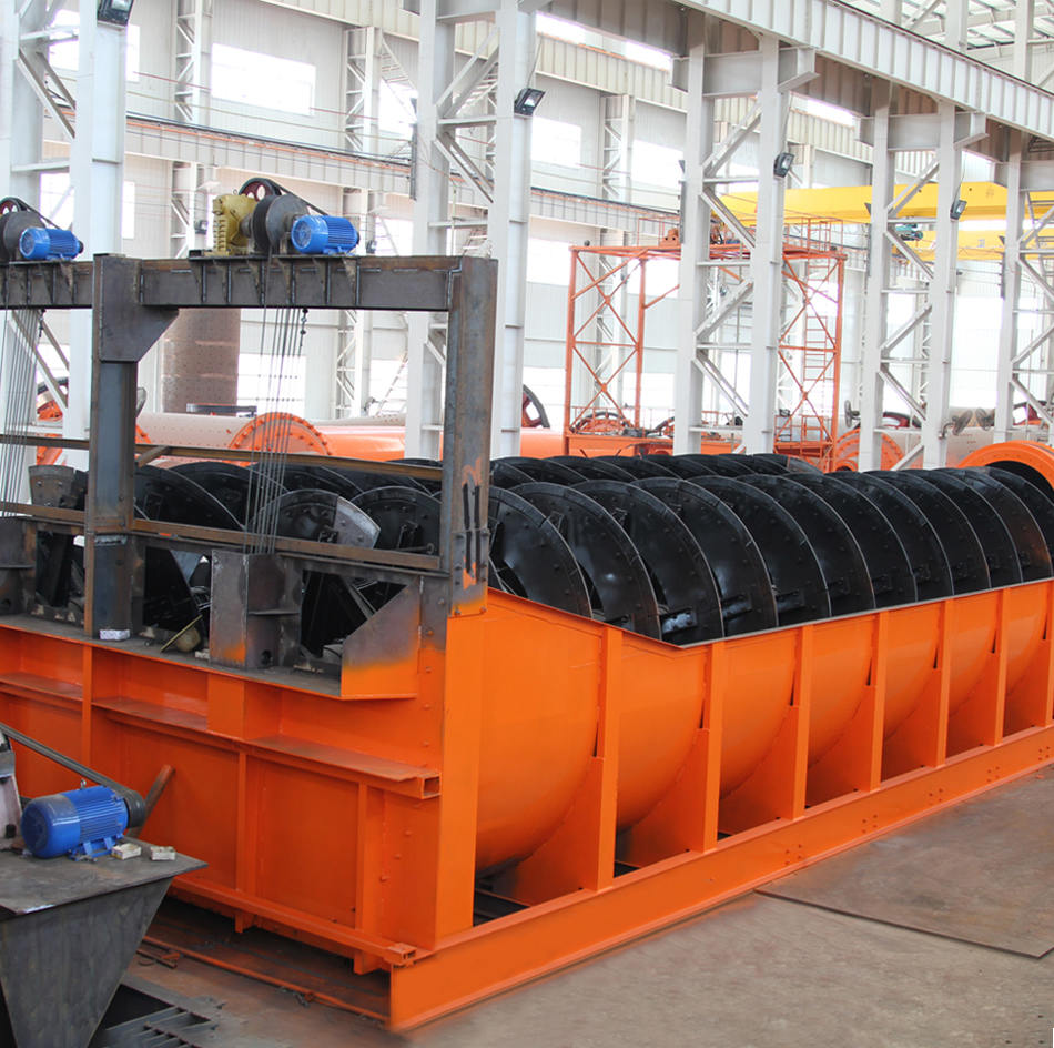 分級(jí)機(jī)工作原理:分級(jí)機(jī)是借助于固體粒大小不同,比重不同,因而在液體中的沉降速度不同的原理,細(xì)礦粒浮游在水中成溢流出,粗礦粒沉于槽底。由螺旋推向上部排出,來(lái)進(jìn)行機(jī)械分級(jí)的一種分級(jí)設(shè)備,能把磨機(jī)內(nèi)磨出的料粉級(jí)加于過(guò)濾,然后把粗料利用螺旋片旋片旋入磨機(jī)進(jìn)料口,把過(guò)濾出的細(xì)料從溢流管子排出。該機(jī)底座采用槽鋼,機(jī)體采用鋼板焊接而成。螺旋軸的入水頭、軸頭、采用生鐵套,耐磨耐用,提升裝置分電動(dòng)和手動(dòng)兩種。